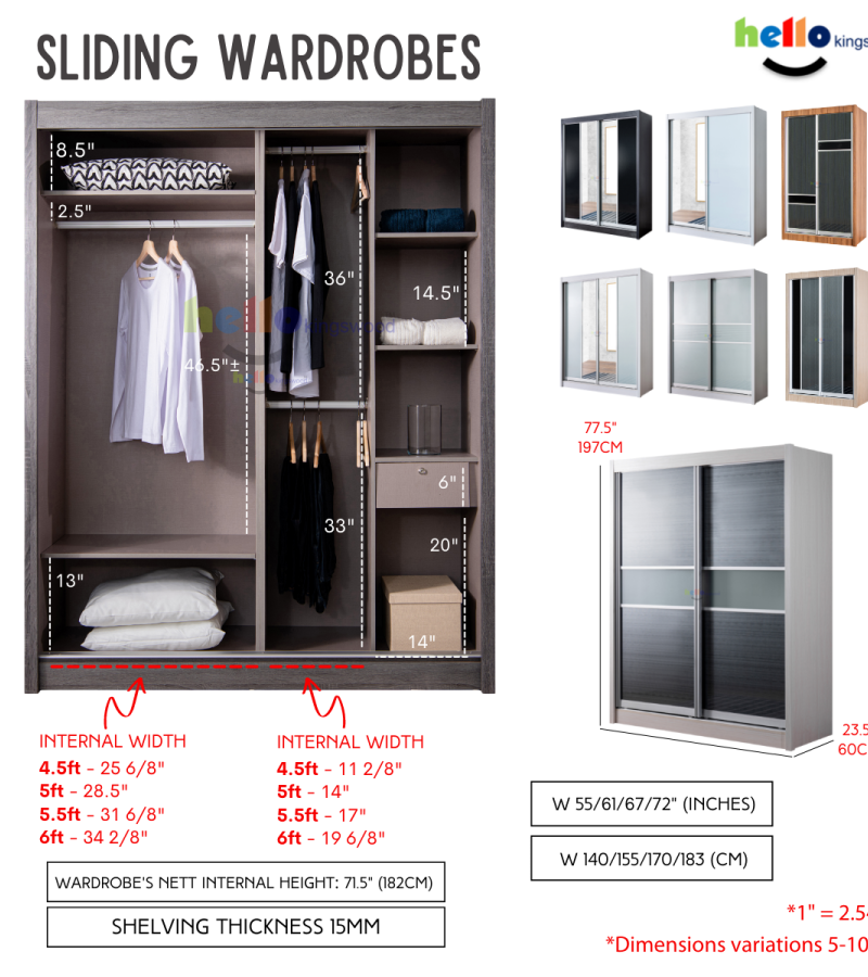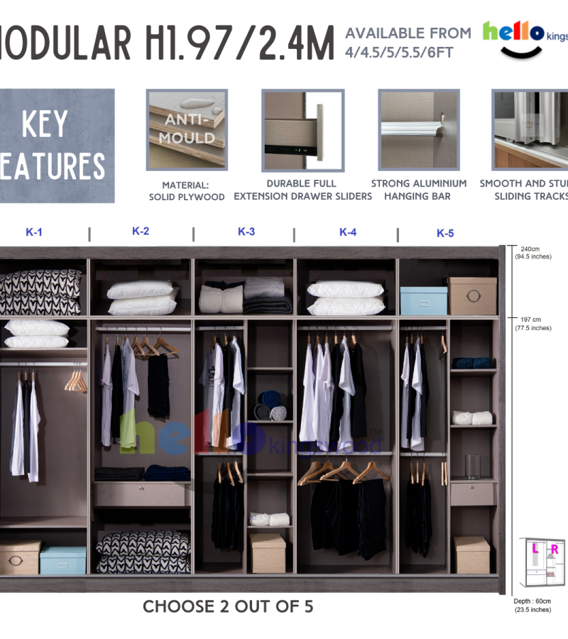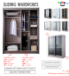 12 months manufacturer warranty Material: Solid Plywood Sturdy aluminium door frame Strong aluminium hanging bar Durable full extension drawer slides Width: 4.5, 5, 5.5, 6ft Height: 1.97m or 2.4m Depth: 60cm Models: Timo, Niko, Scanik, Megan, Joshua Available in 9 trendy colours